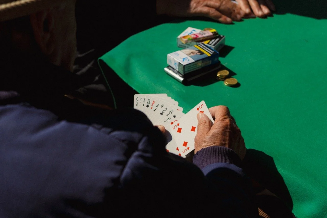 The bright green table balances out the details in the cards and shadows on the left